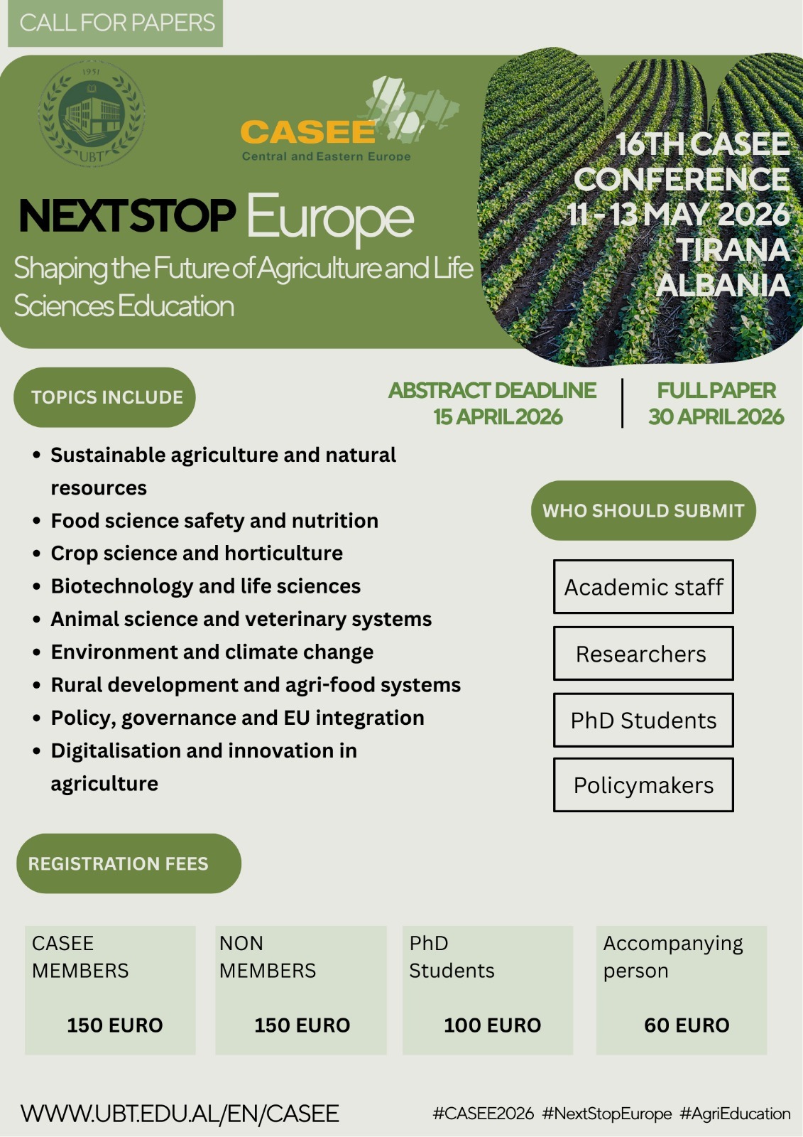 Obaveštavamo vas da će 16. CASEE KONFERENCIJA “NEXT STOP EUROPE: SHAPING THE FUTURE OF AGRICULTURE AND LIFE SCIENCES EDUCATION” BITI ODRŽANA U PERIODU 11-13.05.2026. GODINE NA AGRICULTURAL UNIVERSITY OF TIRANA U ALBANIJI.